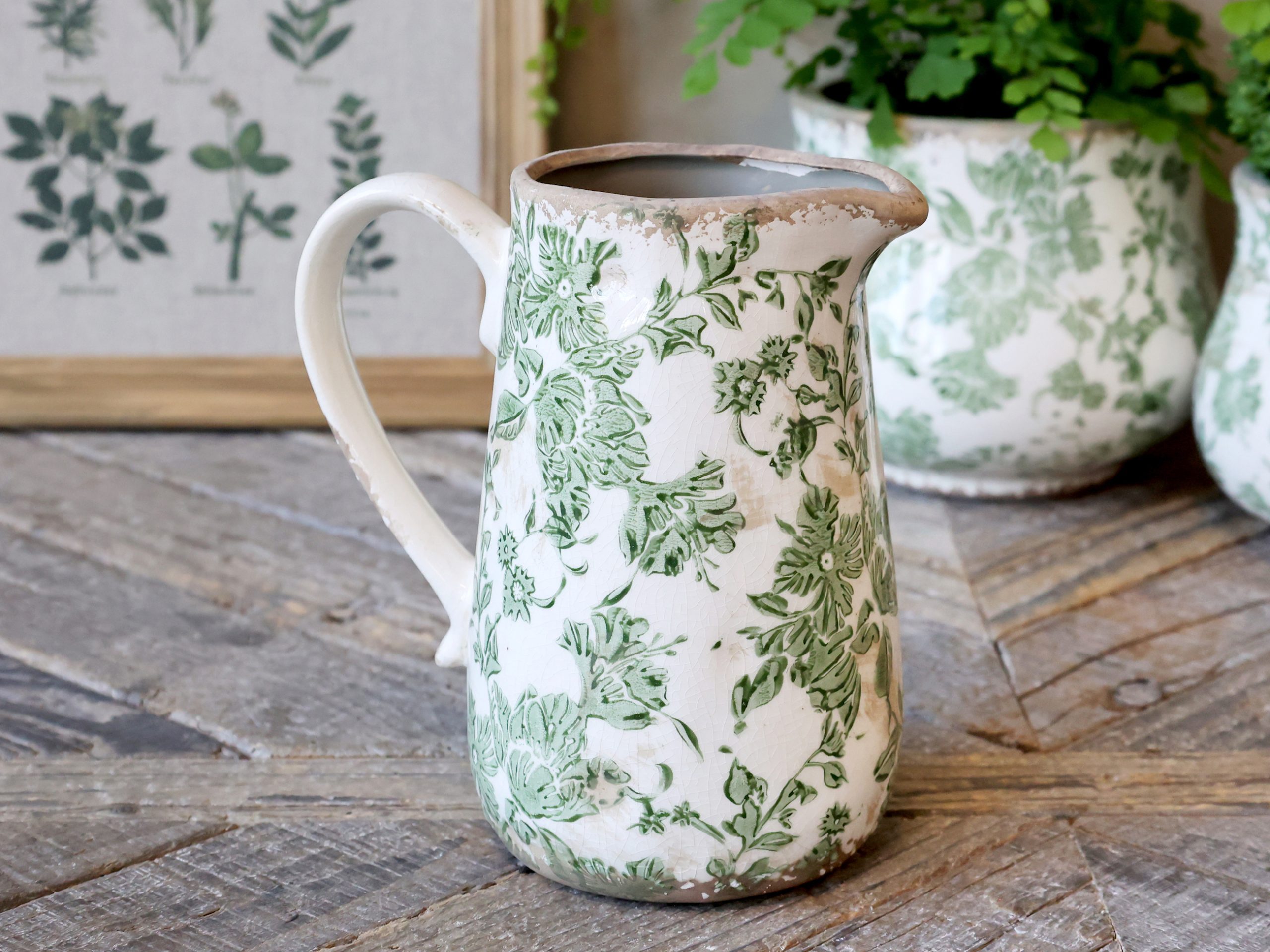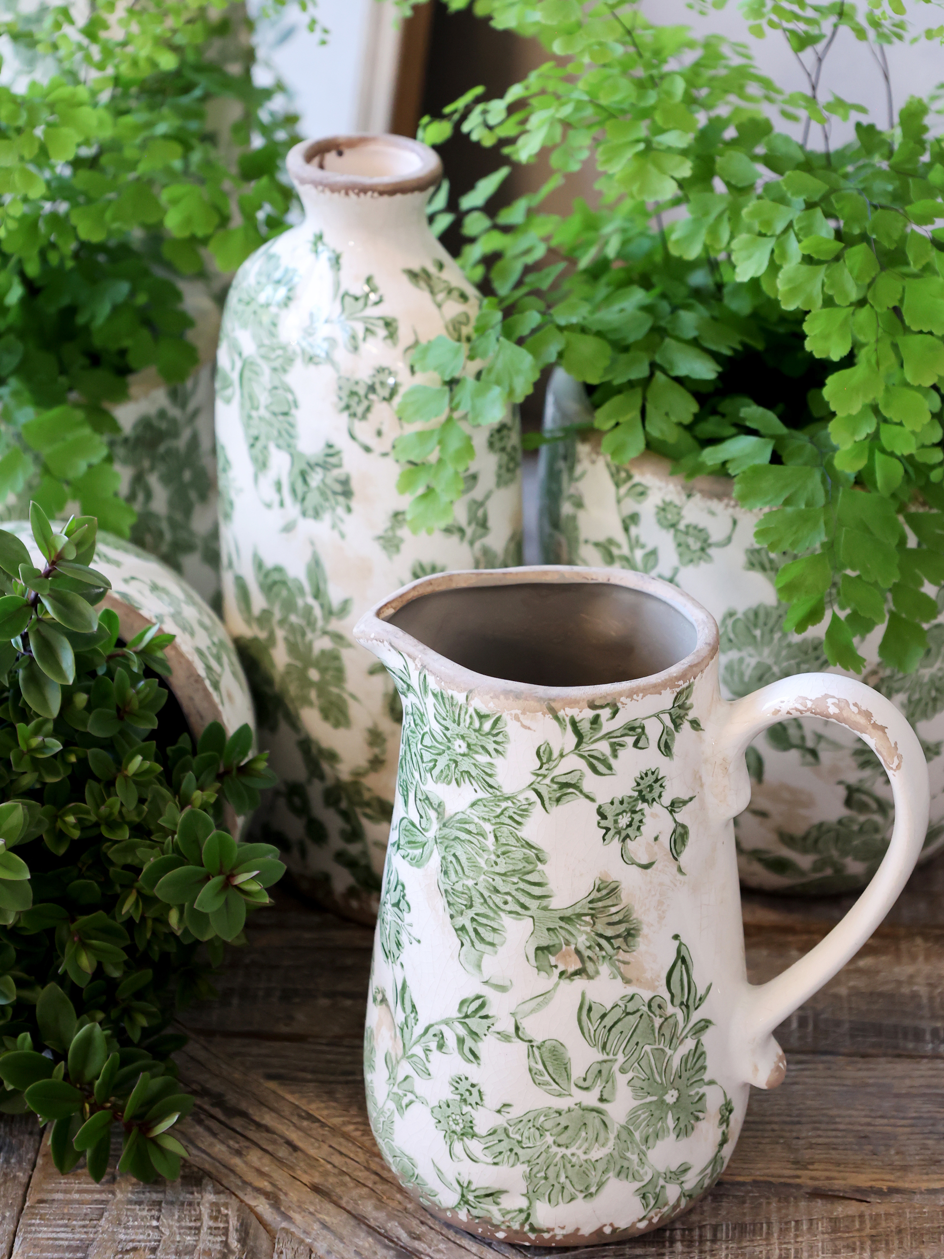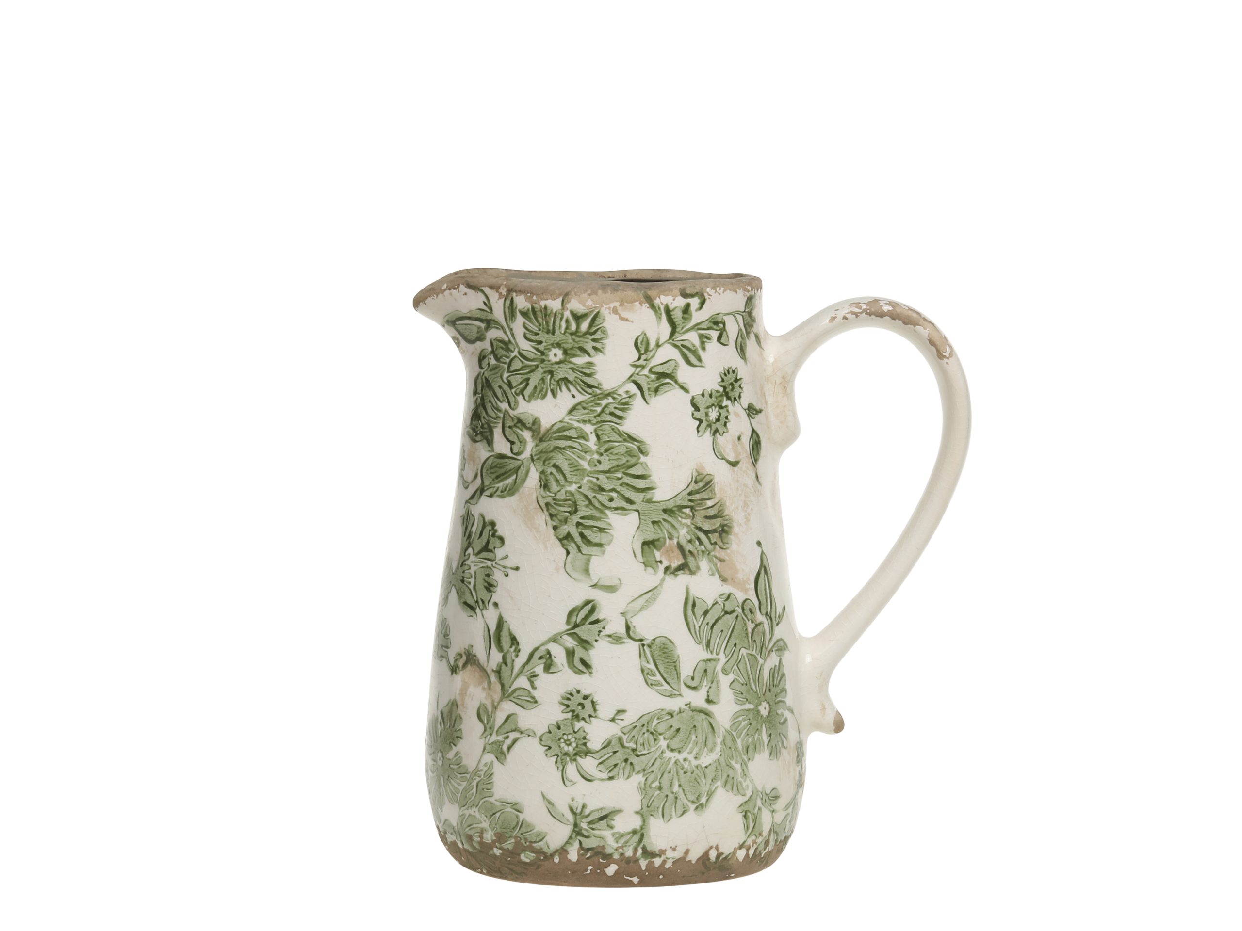 Kannu vihreät kukat, keraaminen.  16 x 11 x 18 cm. Tehty patinoituneen näköiseksi. Pitää vettä. Maljakoksi